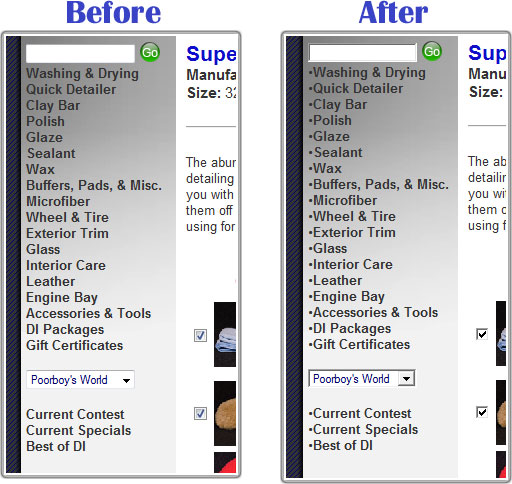 I’ve seen some really nice before/after pictures George has posted in various forums. Some of them were so convincing they had me nearly buying $100+ worth of stuff from DI! However I can’t readily find any links to those highly convincing posts from the website. It would be nice if DI had a small section of before & after pictures of cars with different colors. I drive a black GS 300, and when I saw some before/after pictures of a black Infinity G35 during a detailing, I was VERY close to buying everything in the article. The key was seeing how good my color of paint could look when properly cleaned and polished.