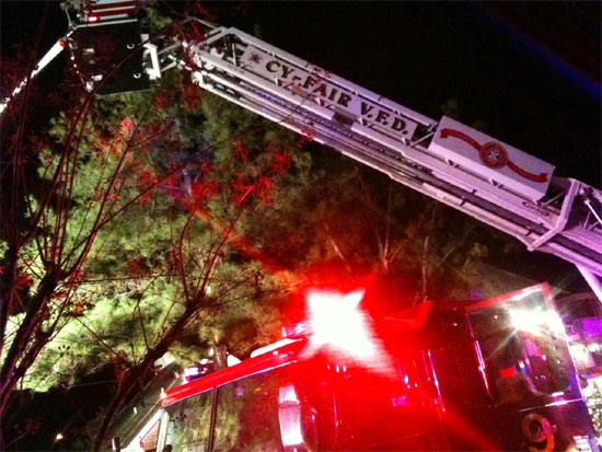 I climbed on my fence to get a better view, and I could see some emergency crew just arrived. I saw an emergency crew guy going to knock on the door of the neighbors house to warn them, but then he started running full speed, and in one completely awesome move he did a flying jump kick which violently burst open the door and ran inside screaming for everyone to evacuate! It was pretty damn awesome.