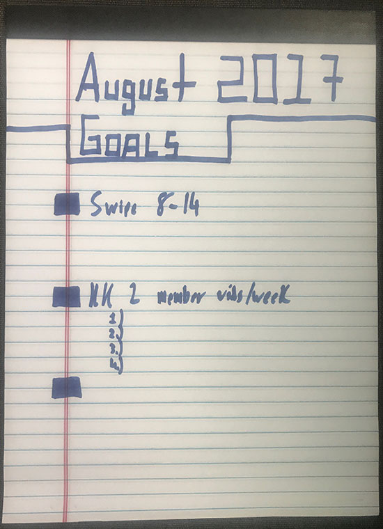 August 2017 Goals August 2, 2017 by Neville Here’s my goals for August 2017: All of August I’ll be living in San Francisco (it’s hot AF in Austin during August so I’m leaving), and will be staying near Hayes Valley and Civic Center area. Had a very productive July and hit all goals:
