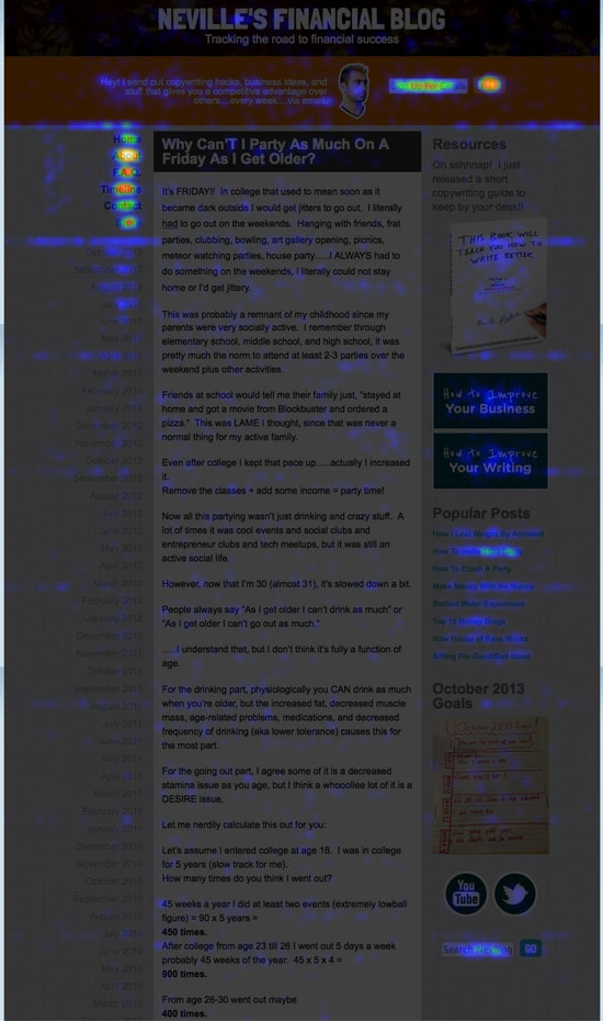 This is a HEAT-MAP overlay of my site from my CrazyEgg statistics. The more people click on a certain part of the site, the more it “heats up” on the image: