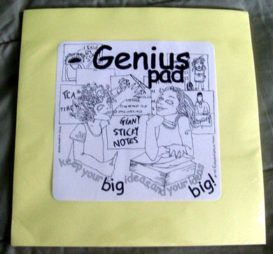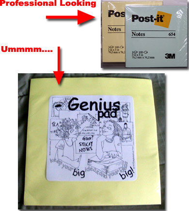 I got a sample of these “Genius Pads” and it’s actually a product with some potential….basically a giant sticky note pad. Dan Sherman took the idea and started distributing them to the U.S. with his own website which has a much better name: Mega Sticky.