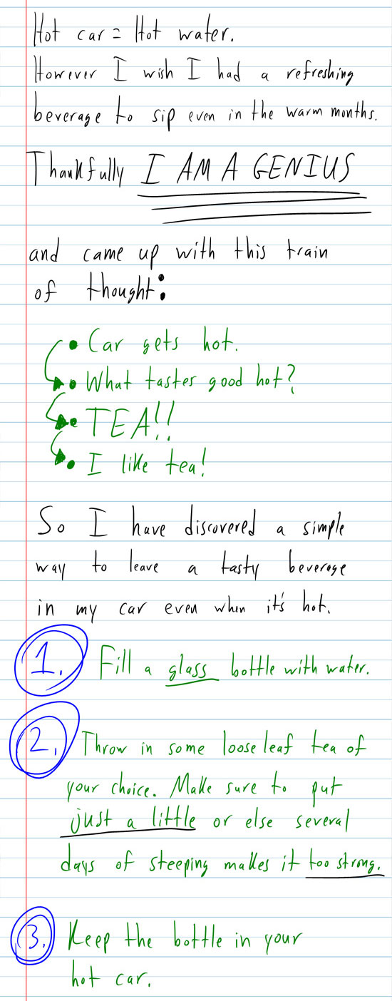 Hot Car = Hot Tea July 25, 2010 by Neville I used to do this with plastic water bottles, but plastic bottles + lots of heat = not good. So now instead of gross water that I never sip, I just keep different flavors of tea in the car all the time!