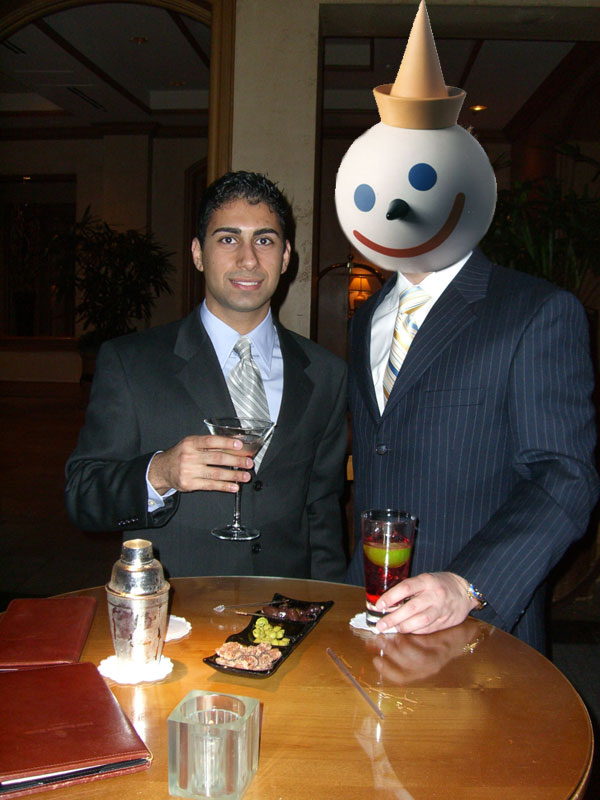 7:00pm my phone rings and “Bob” calls me from his regular hotspot, a swanky hotel, saying he happened to notice a large number of high powered individuals heading to the ballroom downstairs. Party crashing time. I took a quick shower, threw on a suit, got my roommate to tie my tie (because I still don’t know how) and drove to the hotel.