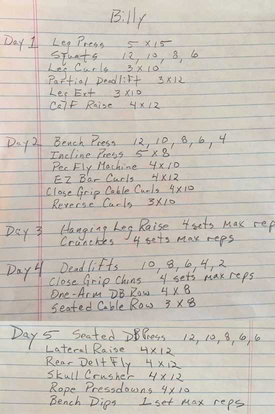 I’m also following Billy’s 5-day workout regimen: