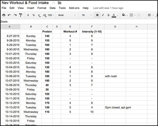 I’m not aiming for his results or closely tracking every workout yet, but I’ve started jotting down a few things to keep me accountable on this spreadsheet: