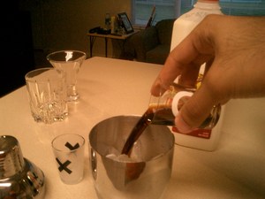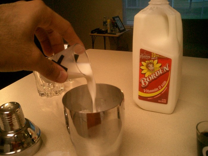 Get your supplies: Starbucks Liquor, milk, ice and a shaker. You will also need a shot glass and a pouring glass.