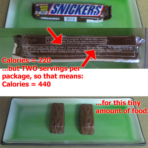 Notice it has 220 calories…but there’s TWO “servings per container”. That means if you eat a full Snickers (who the hell only eats half??) you get a huge 440 calories for something that has virtually zero nutritional value and doesn’t get you full.