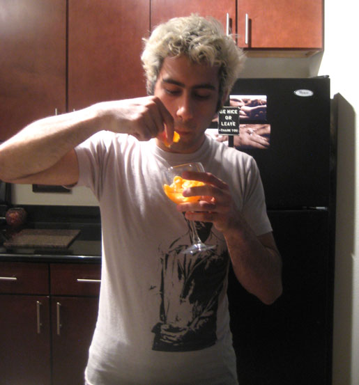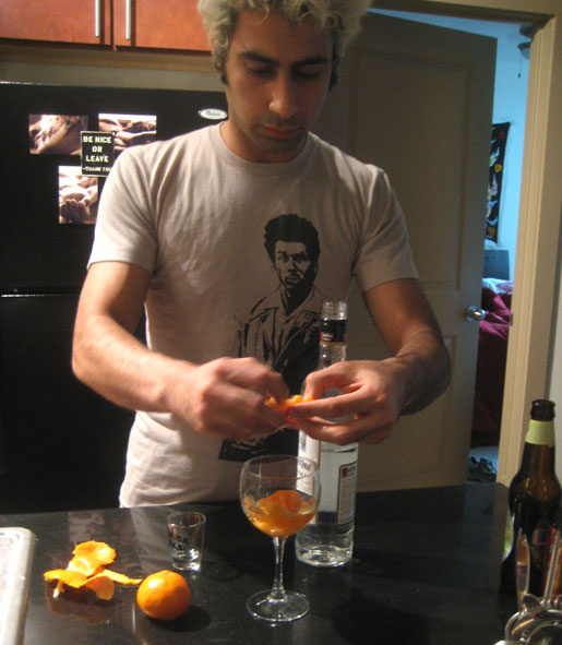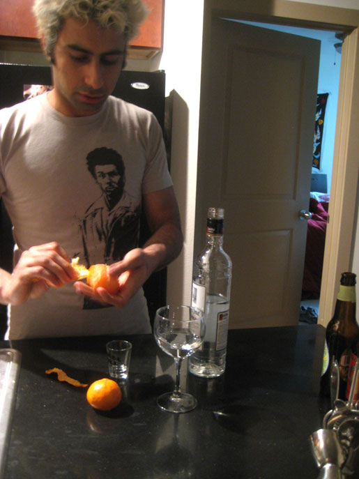 Then I do what seems gross but actually tastes great and tear up a clementine and dump it inside the vodka: